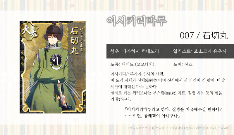 신검 이시키리마루란다. 신사에서는 참배객을 좀먹는 병마를 베는 일을 하고 있었지만, 지금은 네 곁에서 역사를 좀먹는 병마를 베는 것이 일이지. 맡겨줘.