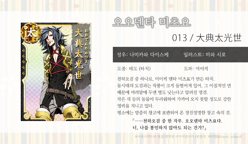 (『활격 도검난무』 공식 홈페이지(https://katsugeki-touken.com/chara/oden.html)에서 인용)