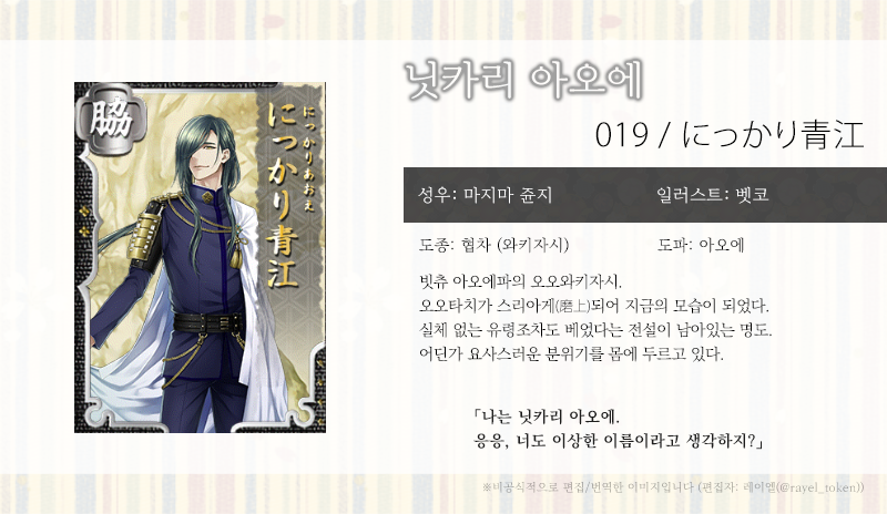 | [소개문 번역] 025-026. 이치고히토후리 (一期一振) (0) | 2019.06.05 |