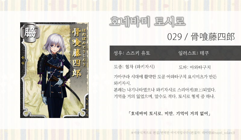 | [소개문 번역] 027-028. 나마즈오 토시로 (鯰尾藤四郎) (0) | 2019.06.05 |