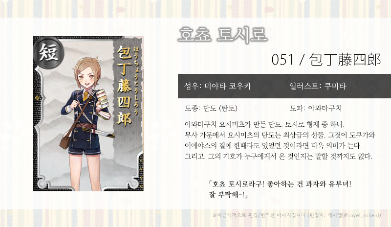 | [소개문 번역] 049-050. 야겐 토시로 (薬研藤四郎) (0) | 2019.06.05 |