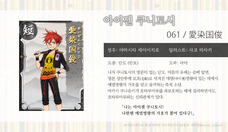 | [소개문 번역] 057-058. 아카시 쿠니유키 (明石国行) (0) | 2019.06.05 |