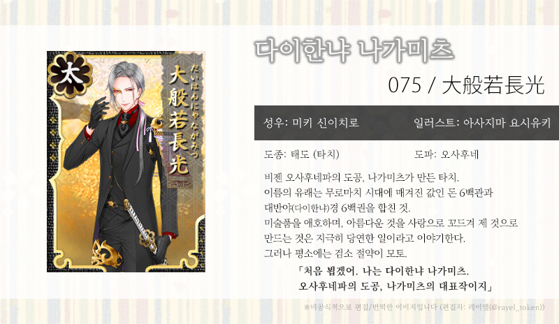 | [소개문 번역] 073-074. 쇼쿠다이키리 미츠타다 (燭台切光忠) (0) | 2019.06.06 |