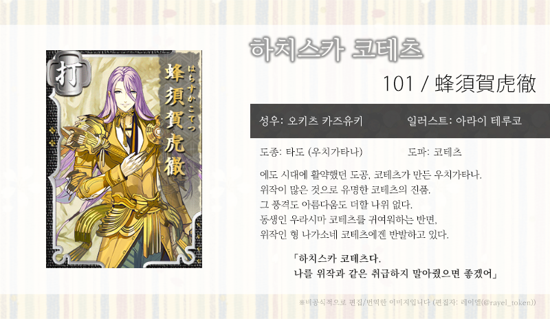 | [소개문 번역] 103-104. 우라시마 코테츠 (浦島虎徹) (0) | 2019.06.06 |