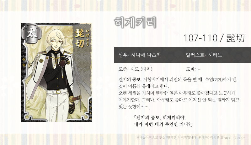 (『활격 도검난무』 공식 홈페이지(https://katsugeki-touken.com/chara/hige.html)에서 인용)