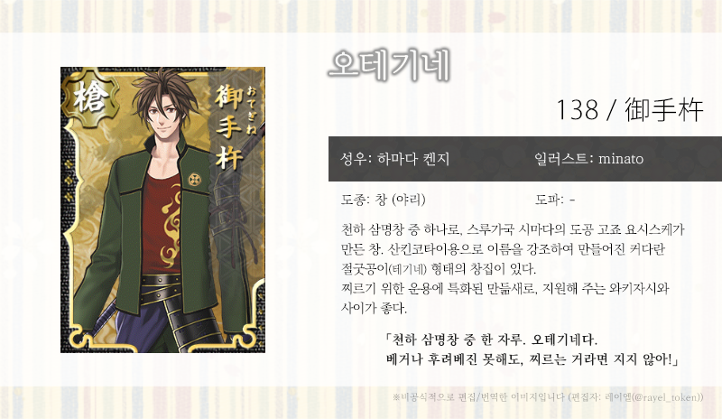 천하삼창으로 불리는 명창(名槍) 중 하나인 오테기네. 마음 상냥한 그는, 와키자시들과 마음이 맞는 듯하다.