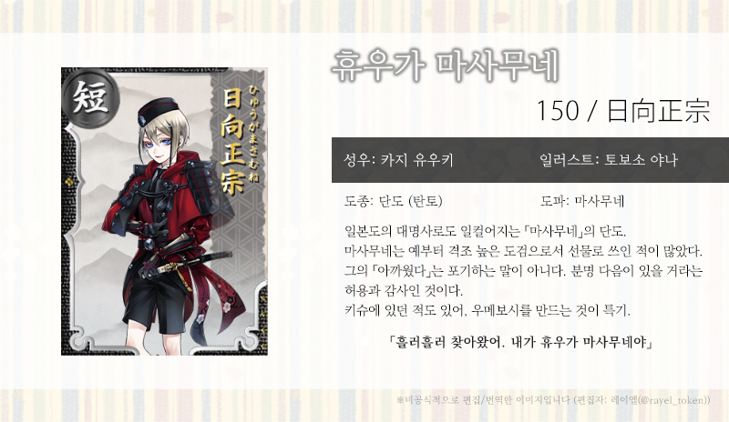 나는 휴우가 마사무네. 카타다 마사무네라던가, 오오가키 마사무네로도 불려. 전 주인 중 유명한 이라면 이시다 미츠나리 님일까?