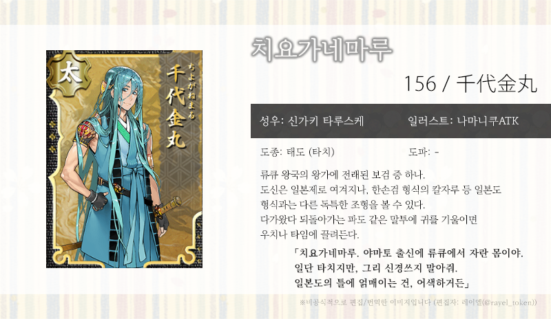 | [소개문 번역] 158. 야만바기리 쵸우기 (山姥切長義) (0) | 2019.06.07 |