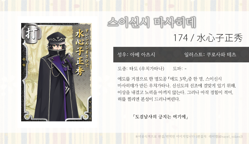 에도를 거점으로 한 명도공 「에도 3작」중 한 명, 스이신시 마사히데가 만든 우치가타나. 신신도의 선조에 걸맞게 있기 위해, 이상을 내걸고 노력을 아끼지 않는다. 그러나 아직 경험이 적어, 허를 찔리면 본성이 드러나버린다.