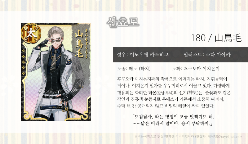 우에스기 가문 선정 35자루(※2) 중 하나, 무명의 이치몬지. 호는 산쵸모. 화려한 하몬이 높은 평가를 받고 있지. ……이렇게 스스로 말하는 것도 좀 그렇지만, 다소 쑥스럼을 타서 말이야. 그래서 수백년 동안 세간에는 모습을 드러내지 않았어. ……그걸로는, 설명이 되지 않을까.