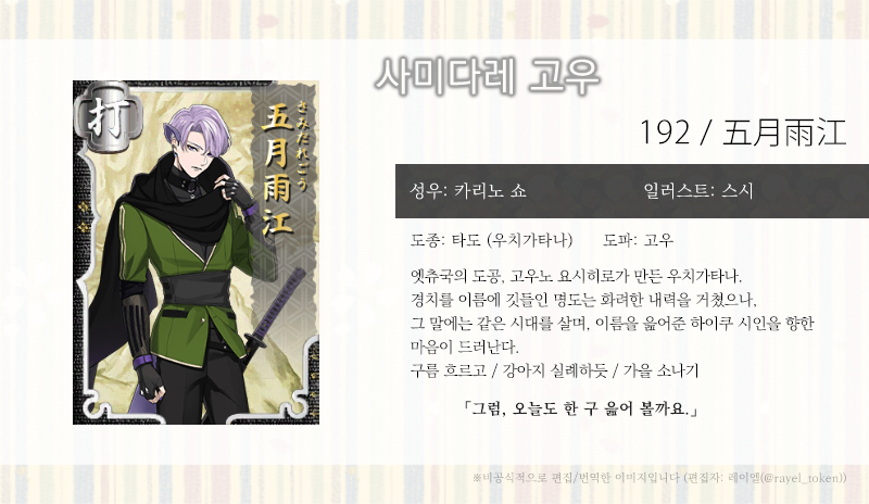 ※2. 사미다레 고우라는 이름의 유래는 '오월비 내리는 계절에 만들어져서', '오월비 내리는 계절에 감정되어서', '칼날의 무늬가 오월비에 피어오른 안개를 닮아서' 등 추측이 다양하다