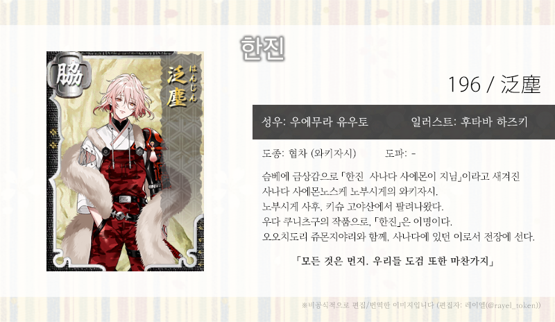 | [소개문 번역] 198. 이치몬지 노리무네 (一文字則宗) (0) | 2021.01.28 |