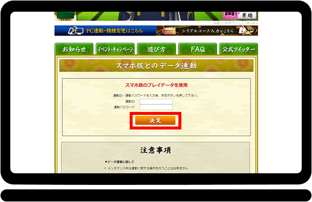 PC브라우저판의 게임 데이터를 써서 플레이하실 경우에는, PC에서 발행한 연동ID와 패스워드를 스마트폰 측에 입력하여 데이터를 연동해 주십시오. (※스마트폰 측의 데이터는 덮어씌워져 사라집니다.) - PC브라우저판의 플레이 데이터는 DMM 계정에 매여 있습니다.