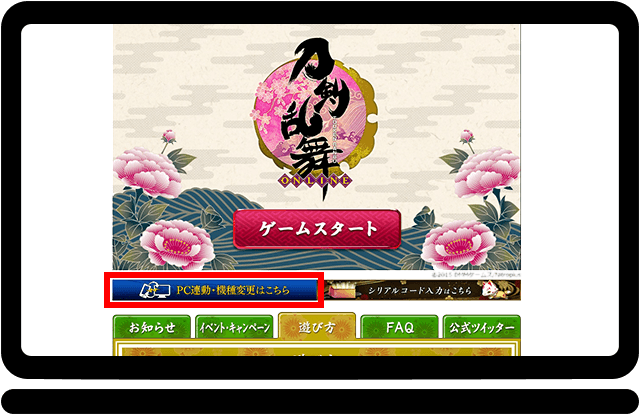 '데이터 연동'은 '도검난무-ONLINE-(이하 PC브라우저판)'과 '도검난무-ONLINE-Pocket(이하 스마트폰판)'의 게임 데이터를 연동시킬 수 있는 기능입니다.