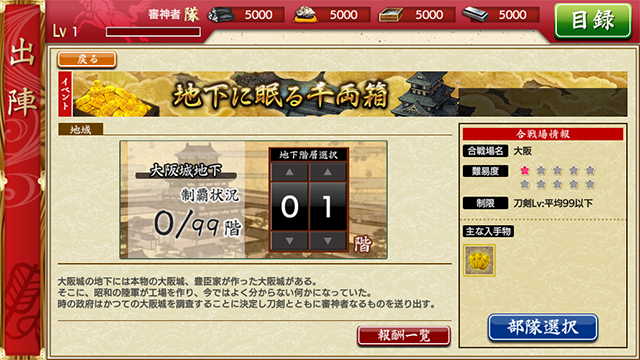 - 오사카성 지하는 전 지역이 야전 등이 없는 통상 합전장입니다. 오오타치(대태도)나 나기나타(치도)가 유리합니다만, 단도를 동행한 부대로 조사를 진행하면 자원칸으로 갈 확률이 약간 오릅니다.