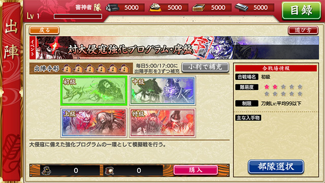 「초급」부터 「특급」까지 4종류 중 임의의 합전장을 선택하여 출진합니다.