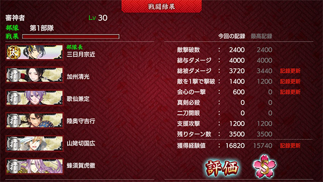 각 항목의 최고기록은 전투 결과 화면의 오른쪽에 「최고기록」으로 표시됩니다.