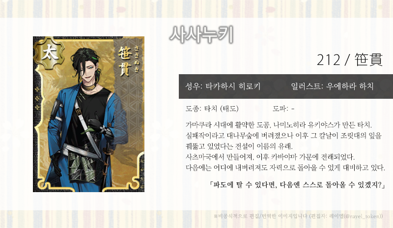 | [소개문 번역] 206. 시치세이켄 (七星剣) (0) | 2022.04.12 |